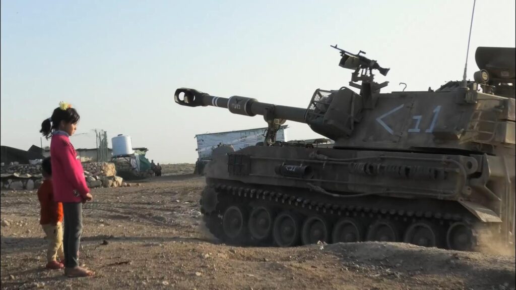 בהמשך הסרט, הסצנה חוזרת מזווית אחרת, כפי שמופיע בתמונה (2): שתי ילדות ניצבות מול קנה הטנק בצילום לונג שוט. הבגדים הצבעוניים, הקישוט הקטן בשיער, עומדים בניגוד חריף לאפור הקר של הטנק. הניגוד הוויזואלי מחדד את הדפוס הסמנטי: ילדות שממנה הילדה תישא בזיכרונה לא משחקים או ביטחון, אלא טנקים, צווים ואלימות מתנחלים.