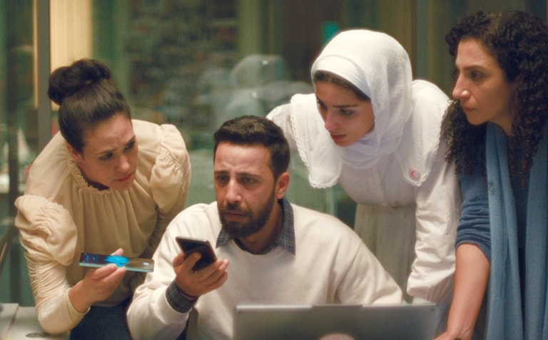 בתמונה מספר 3 שמציגה את גיבורי הסרט המתקבצים סביב שולחן במשרד הסהר האדום הפלסטיני, ניתן לראות את המתח בהבעות פניהם ומבטיהם הנעים בין תקווה לכאב. למרות שכולם מרוכזים בטלפון, ולמרות שהדמויות נוכחות פיזית, הן כמעט נעדרות מהאירוע. האירוע האמיתי מתרחש מחוץ למסגרת באמצעות קול, בעוד שהמרחב הוויזואלי הופך למרחב המתנה.